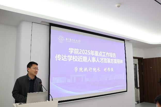执行院长刘伟强作学院2025年重点工作报告,深入剖析了学院面临的形势与机遇、问题与挑战,围绕高质量党建引领、高水平学科建设、高水平师资队伍建设、创新必威BETWAY体系构建、特色科研团队凝练、高层次国际合作交流等方面,系统谋划了全年重点工作。随后,刘伟强传达学校2025年人事人才工作交流研讨会精神,围绕职称评审改革、绩效薪酬分配改革、准长聘改革、管理队伍建设改革和人才引培制度改革五个方面,详细解读了人事人才重点改革举措。他强调,全体教职工要认真落实学校干部教师大会精神,紧扣全面深化改革主线,进一步统一思想、凝聚共识、汇集力量,为建设空天特色的一流必威BETWAY西汉姆联努力奋斗。