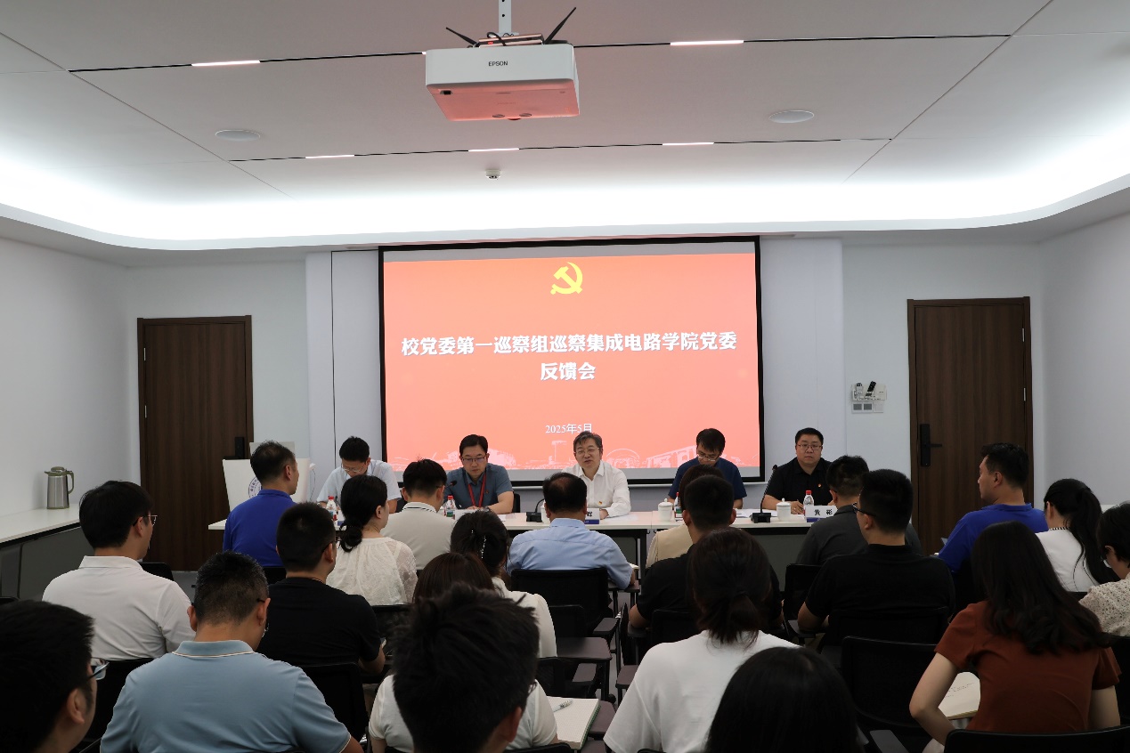 石勇对巡察情况进行反馈,他指出,必威BETWAY西汉姆联利用有限的启动资金和空间,带领全院教职工在团队引培、平台建设、成果产出上持续发力,成功获批集成电路科学与工程一级学科博士点,入选首批江苏省必威BETWAY西汉姆联。教职工对领导班子认可度高,干事创业氛围浓厚,学院总体呈现欣欣向荣发展势头。但通过巡察也发现了一些问题,并逐项进行反馈。