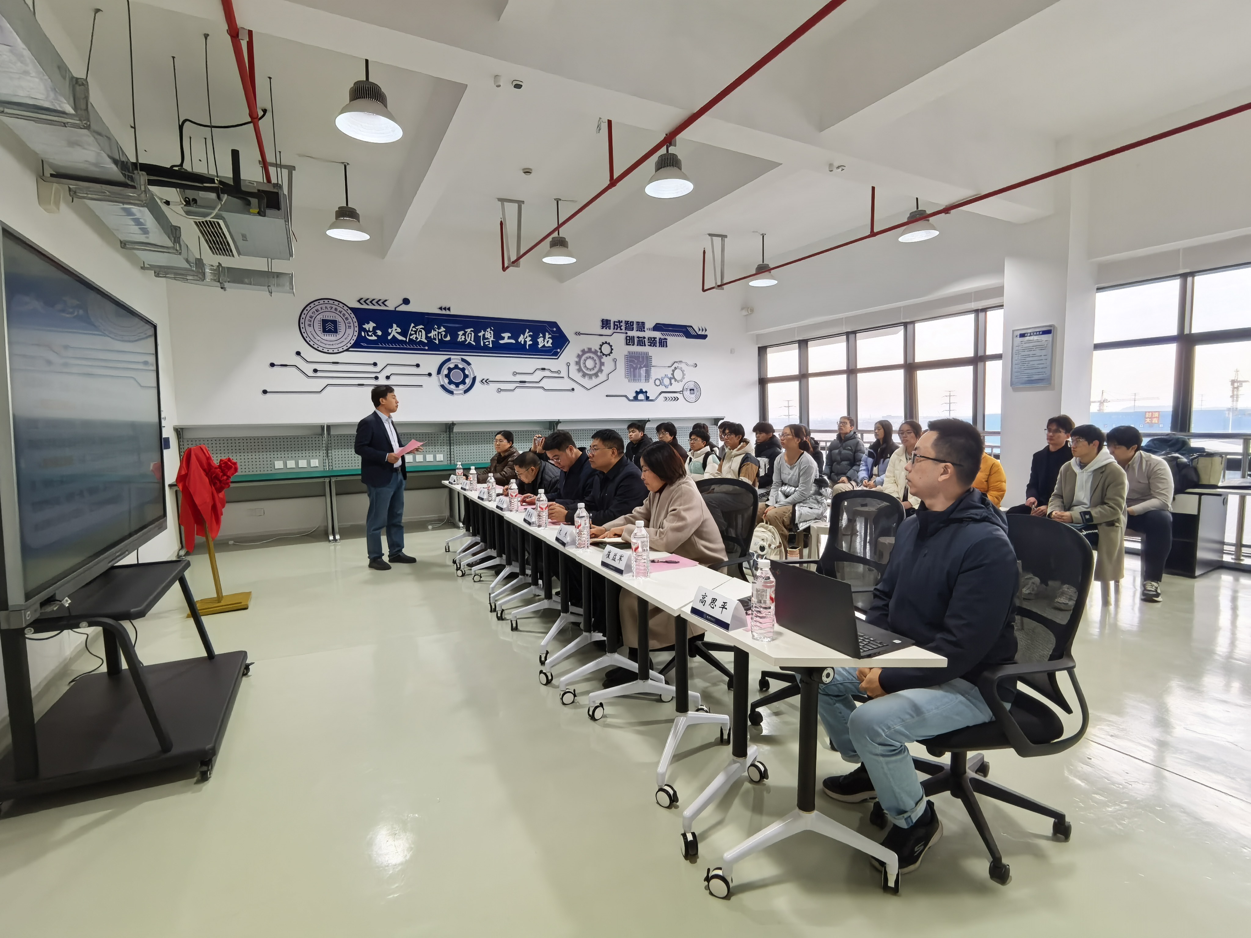 在热烈的掌声中,缪长宗、贡海俊、黄彬共同为工作站揭牌。未来,工作站将通过“值班指导制度”搭建跨校区交流桥梁,重点破解院院协同不足、专业认知模糊、科研入门难等问题,培养具有家国情怀、专业素养与创新能力的集成电路领域后备人才。