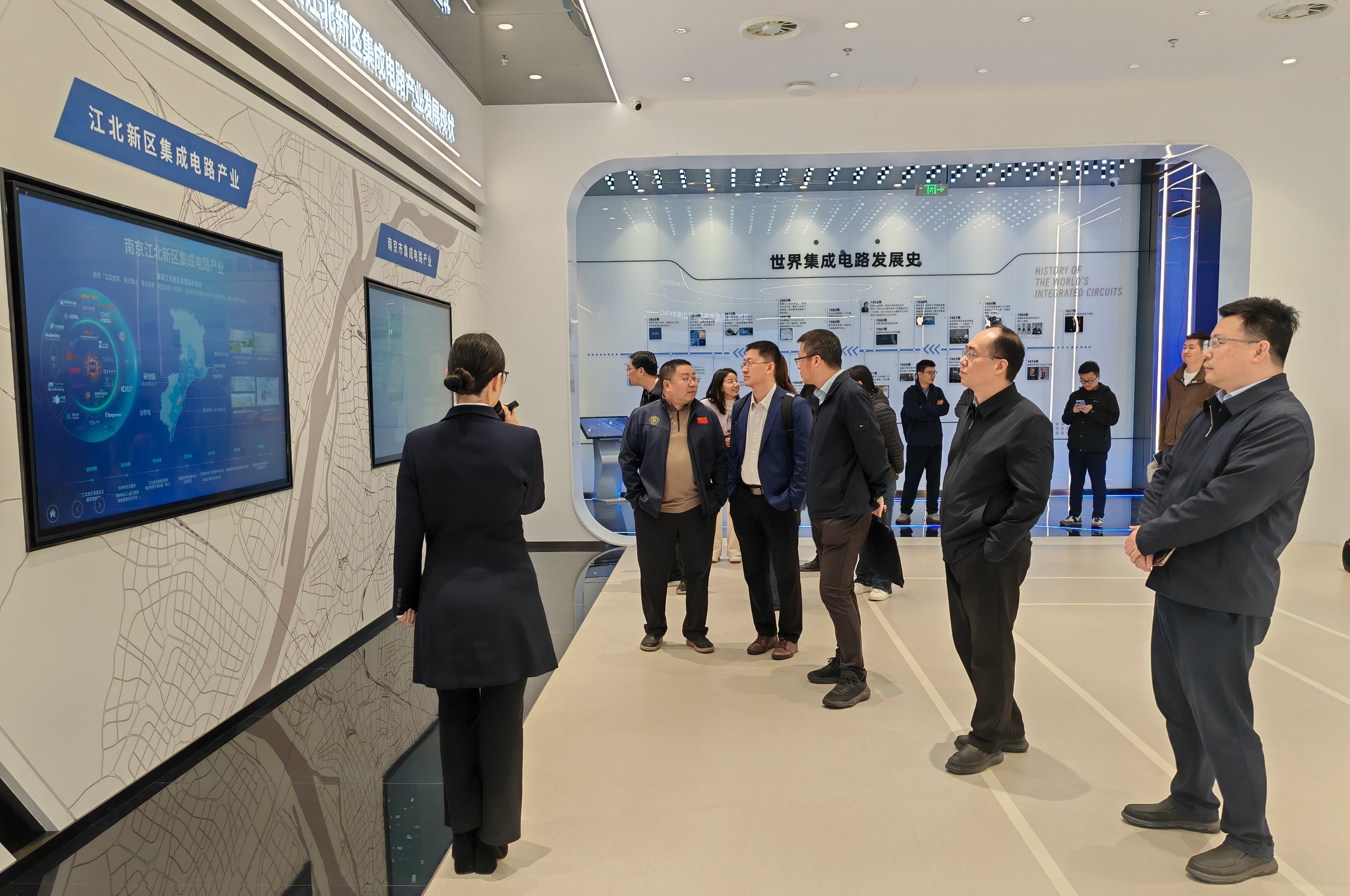 全体人员首先前往江苏华创微系统有限公司,深入了解其发展历程和业务布局。校政企三方就学生实习实践、技术联合攻关等合作方向进行现场交流。在江北新区科学城集成电路国家芯火平台,大家详细了解平台的建设背景与功能定位,深刻感受到平台在推进科技资源优化配置、开放共享和高效利用等方面的公共服务能力。