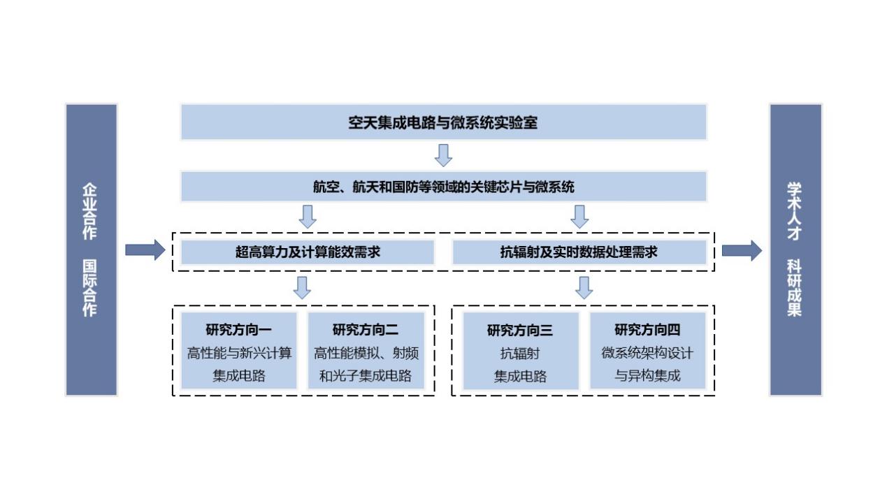 面对“空天”系统新型应用场景对核心芯片技术提出的超高算力及计算能效需求和抗辐射及实时数据处理需求,实验室致力于高性能与新兴计算集成电路、高性能模拟、射频和光子集成电路、抗辐射集成电路与微系统架构设计与异构集成等方向的研究,紧密结合航空航天特色,承担国家重点课题、重大工程,服务国家发展战略,产出具有自主知识产权的重大科研成果,培养国内知名、学风正派、经验丰富的中青年学术带头人。
